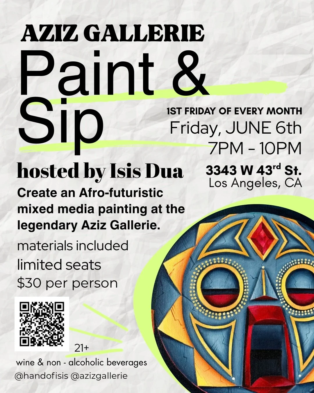 Weβre excited to announce our first Hand Of Isis and Aziz Gallerie Paint & Sip experience. Join us the 1st Friday of every month and explore your creativity in a beautiful gallery space.